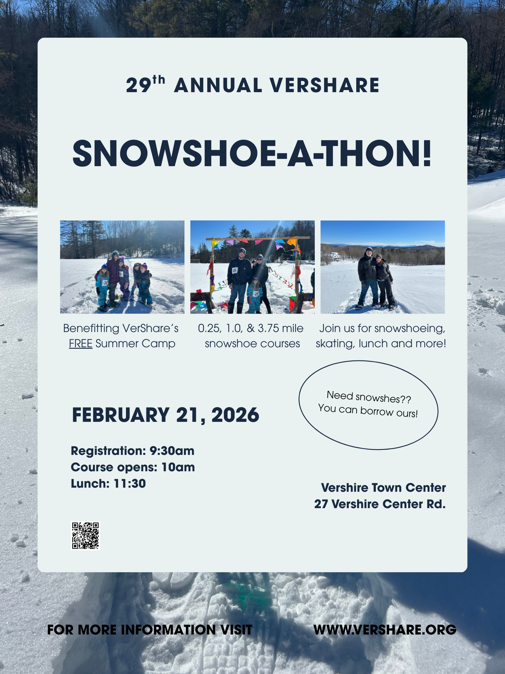 Join us at this February's Mountain School co-sponsored snowshoe fundraiser for VerShare's summer camp. Register here. February 21, 9:30am-1:30pm.